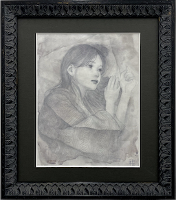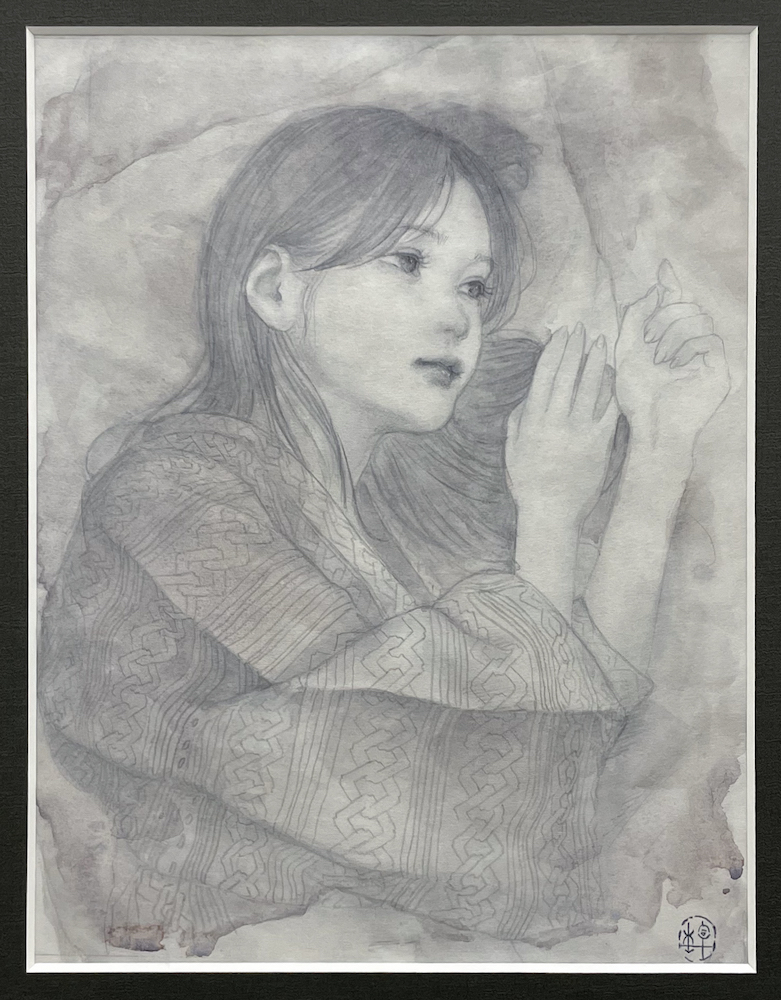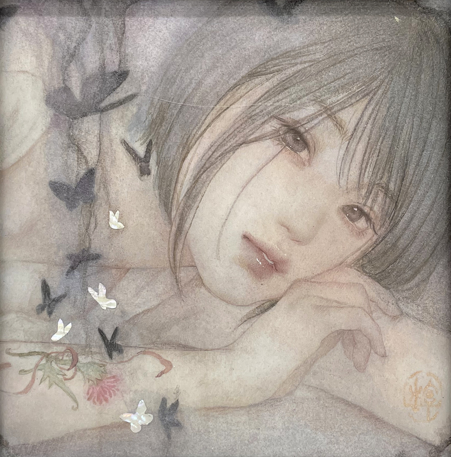 墨、鉛筆、透明水彩、あわび貝 / 白麻紙