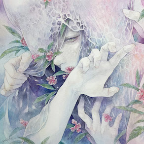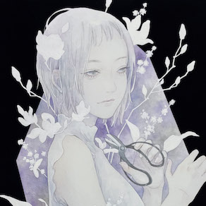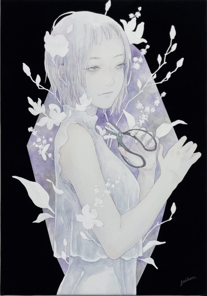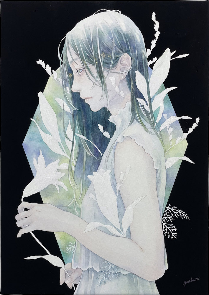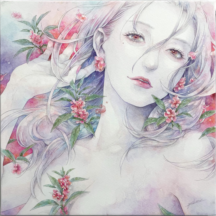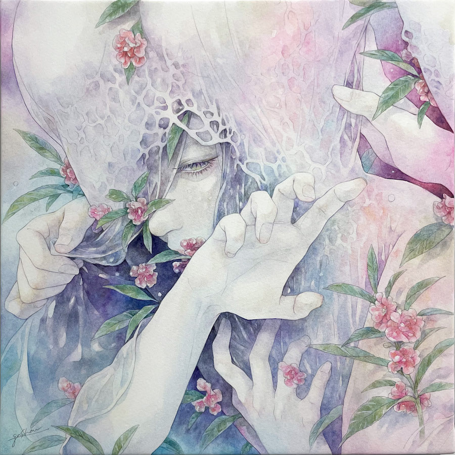 透明水彩、アクリルガッシュ、アクアブロンズ、鉛筆/水彩紙、木製パネル